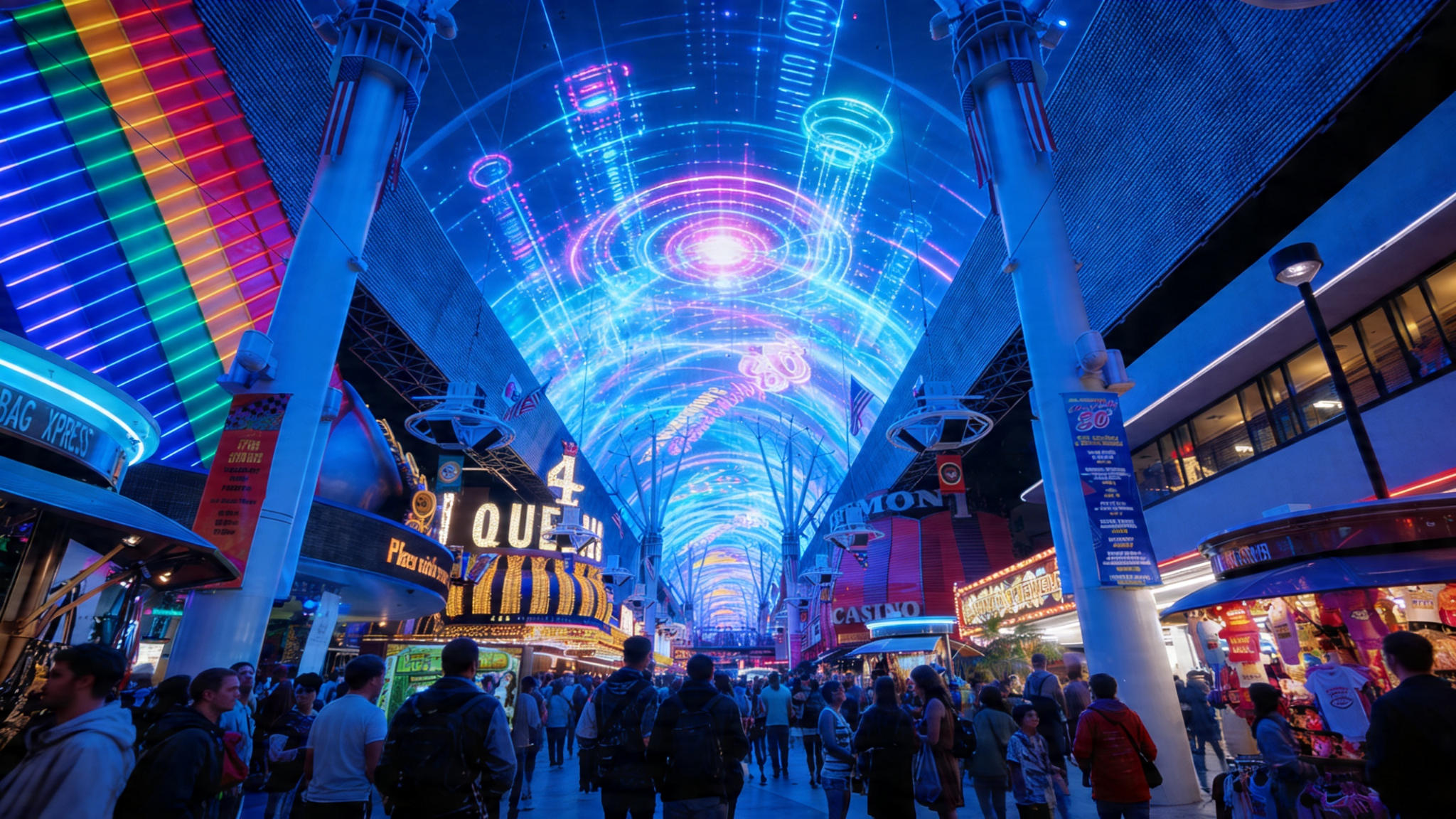Fremont Street Experience is a five-block open-air pedestrian district in historic downtown Las Vegas, covered by the Viva Vision Canopy, a 1,375-foot-long, 90-foot-wide LED screen suspended 90 feet above the street. It is the largest digital display on the planet. The entire district operates as a free entertainment destination with live concerts across three stages every single night of the year, free Viva Vision light shows at the top of every hour starting at 6pm, street performers, ziplines, casinos, bars, restaurants, and some of the most memorable people-watching available anywhere in this city.
